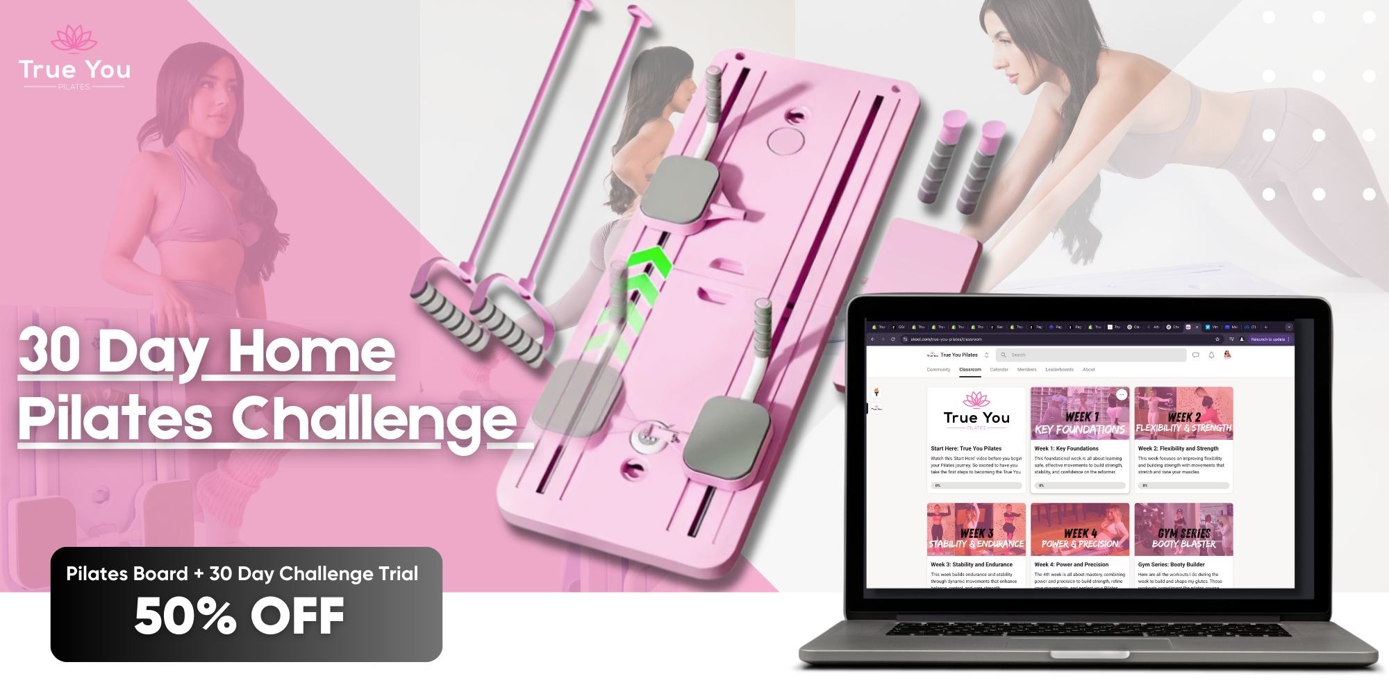 Purchase a True You Pilates Board Today For 50% off! Already have one? Click The Link Below To Get Access To Our 30 Day Pilates Challenge And Community!